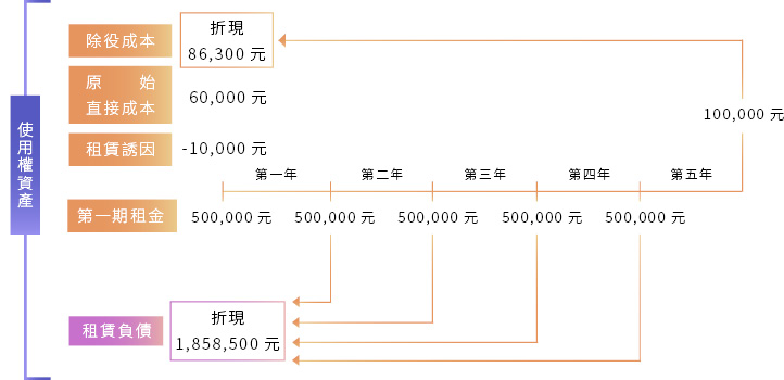 租賃負債$1,858,500+原始直接成本$60,000+租賃開始日前已付之租賃給付$500,000-租賃誘因$10,000+除役成本$86,300