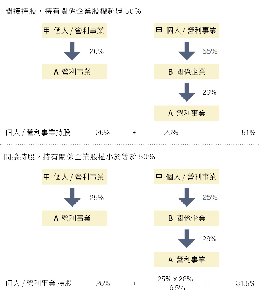 1.依照財政部於111年1月25日發佈之台財稅字第11000633640號令及第11000633641號令,規定營利事業/個人直接或間接持有國內外營利事業過半數股份或出資額之認定標準,直接持股者依持股比率計算。而間接持股者,持有關係企業股權超過50%、或具有重大影響力,依關係企業持股比率合併計算;若持股股權小於等於50%,則按關係企業各層持有比率相乘積合併計算。下面以圖示舉例: