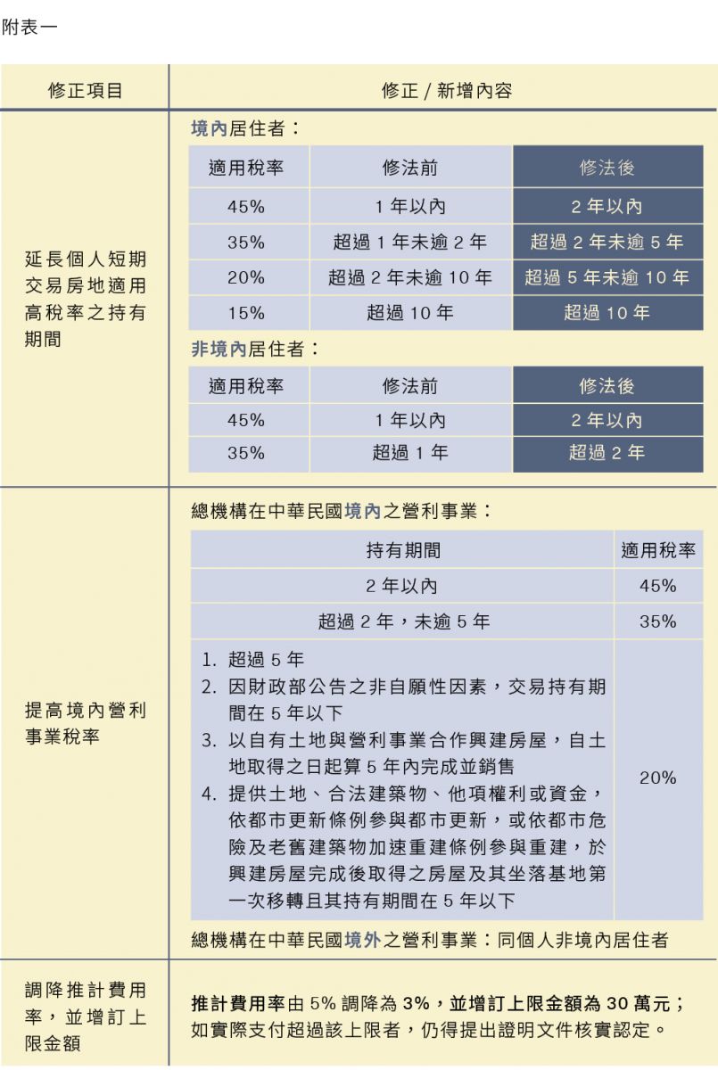所得稅法關於房地合一之條文2.0於110年修正,自110年7月1日起開始實施,與1.0較大的差異除了延長個人短期交易房地適用高稅率之持有期間、提高境內營利事業稅率外(詳附表一),另外亦新增課稅範圍,一為交易預售屋及其坐落基地 、二為 個人或營利事業交易持股(或出資額)過半數營利事業的股份(或出資額),且該營利事業股權(或出資額)價值50%以上係由我國境內房地構成,藉以防堵透過假借公司股權移轉之名、行房地交易之實的避稅行為,為此次修正條文之重點。以下針對兩項新增課稅範圍說明: