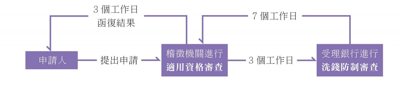申請人需先洽詢受理銀行(建議找尋熟悉的往來銀行)並備齊洗錢防制審查文件,併同申請書及身份證明文件向國稅局申請。