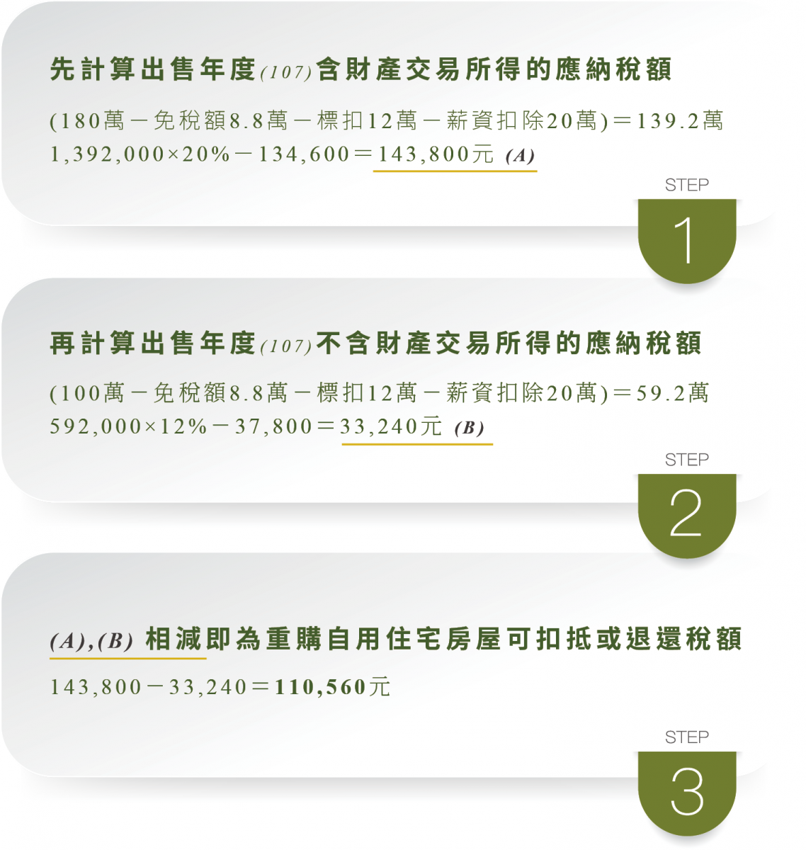 舉例來說,王先生(單身)於民國107年出售舊制自用住宅一戶,該房屋原始買進成本為500萬元,賣出價額為580萬元(不含土地價款),107年度應申報財產交易所得為80萬元(假設王先生另有薪資所得100萬),108年10月1日王先生購買新房屋一戶供自住使用,房屋價款為600萬元,重購之自用住宅價額高於原出售之自用住宅價額(即600萬元>580萬元),此時,王先生108年度申報綜所稅時即可申請扣抵或退還107年度已納財產交易所得之綜合所得稅額。計算如下:
