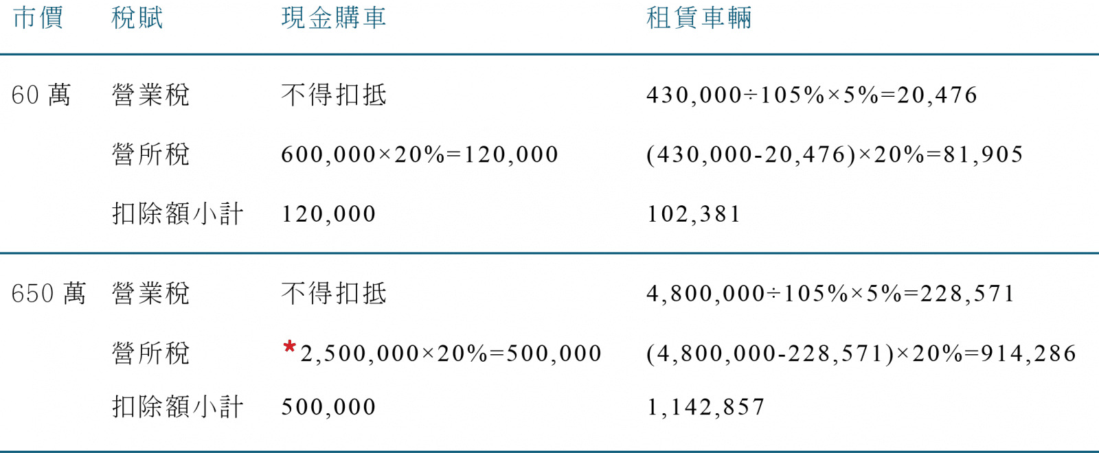 假設市價60萬車輛,三年期合約年度租金為43萬元;市價650萬車輛,三年期合約年度租金約480萬元。簡單舉例分別以現金購車之整體稅負與租賃車輛三年期租金累積稅負比較,其稅務上可扣除得稅額分別如下: