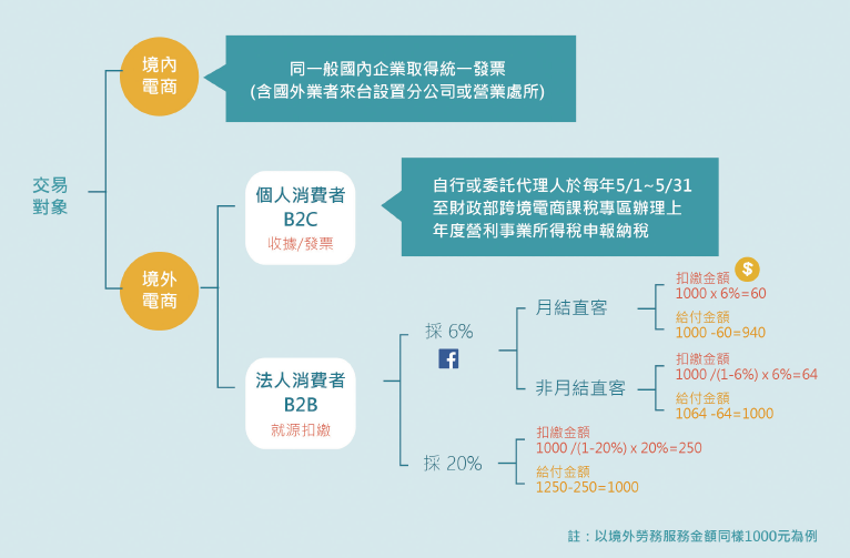 若是企業消費者(B2B)與跨境電商交易,則須代跨境電商扣繳所得稅,採就源扣繳方式繳納營利事業所得稅,目前只有FB申請6%扣繳率,其他則按勞務所得扣繳20%。而扣下來的款項填寫繳款書並繳納稅金後,須填寫「國外營利事業跨境銷售電子勞務專用」之扣繳憑單及扣繳明細申報書,且於給付跨境電商款項後10日內完成申報(可採網路或人工)。