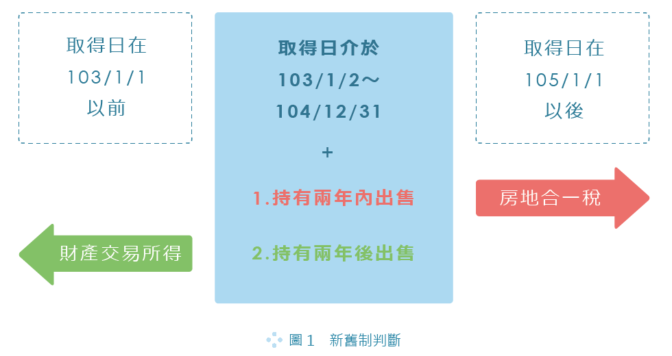 自房地合一於105 年1 月1 日正式上路之後,當我們出售房地時,就必須搞清楚這筆房地的「取得日」是哪一天,並以該「取得日」來判斷報稅時應適用舊制( 土地免稅、房屋