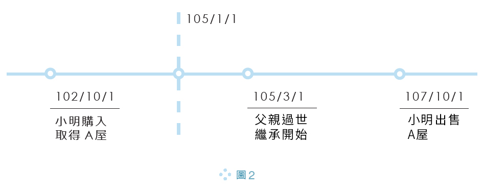 舉例說明(請見圖2),父親於102/10/1購入取得A屋,之後不幸於105/3/1過世,A屋由兒子小明繼承,而小明於107/10/1出售A屋,此時小明出售A屋的所得,在報稅時應適用舊制還是新制呢?