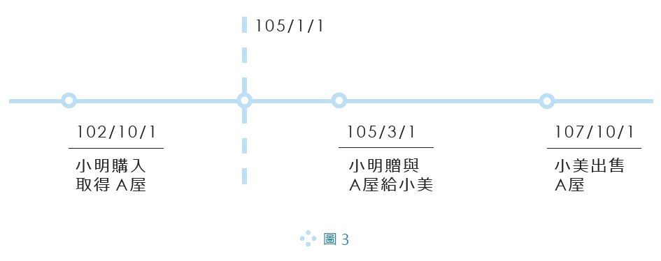 舉例說明(請見圖3),小明於102/10/1購入取得A屋,之後於105/3/1贈與給配偶小美,而小美於107/10/1出售A屋,此時小美出售A屋的所得,在報稅時應適用舊制還是新制呢?