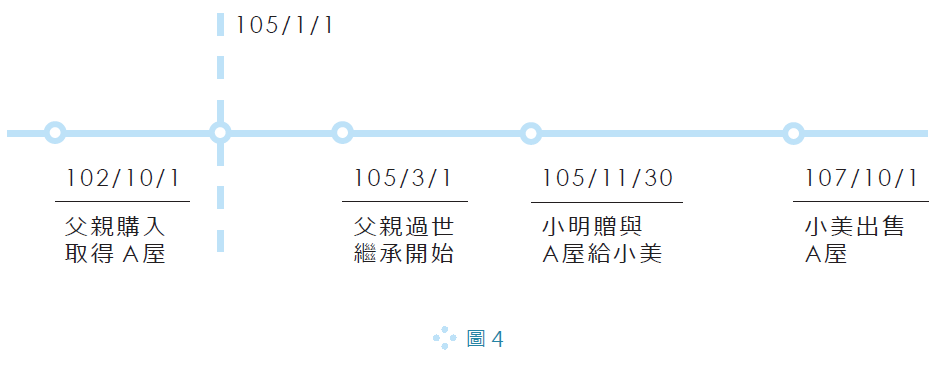 舉例說明(請見圖4),父親於102/10/1購入取得A屋,之後不幸於105/3/1過世,A屋由兒子小明繼承,而小明於105/11/30贈與A屋給小美,而小美於107/10/1出售A屋,此時小美出售A屋的所得,在報稅時應適用舊制還是新制呢?