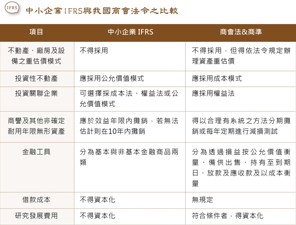 綜上所述,我國商業會計法與商業會計處理準則之修正,並未直接採用中小企業IFRS,乃以中小企業IFRS為基礎,並融合Full IFRS及我國一般公認會計原則,從上述有關投資關聯企業仍維持權益法之會計處理、研發費用仍得資本化等規定可略知一二。